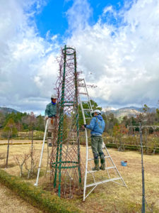 現在、園内はオベリスクのつるバラの誘引作業中です