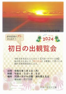 初日の出観覧会のお知らせ2023年12月11日 in 全部 by bagatelle 初日の出観覧会のお知らせ 令和6年1月1日 午前6時30分~8時 河津バガテル公園 海の見える丘にて 初日の出を観覧していただくため園内を無料開放いたします。当日の日の出時刻は6時51分ごろです。 バガテル公園は日の出が見えるように向きも計算され設計されたそうです。ぜひご来園ください。