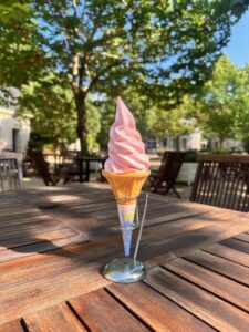カフェではランチセット(ピラフ・ミートソース¥1100)やケーキセット(チーズケーキ・アップルパイ¥1100)、バラソフト🍦¥450