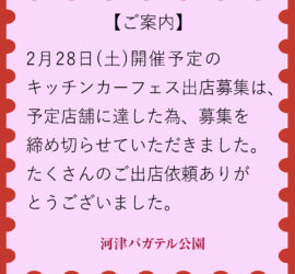 キッチンカー出店募集は締め切りました2026年1月19日 in イベント情報 / インフォメーション / 全部 by bagatelle 1月31日まで募集の予定でしたが、予定台数に達したため、キッチンカーの募集を締め切らせていただきまし […]