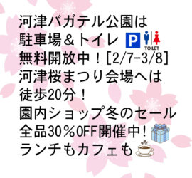 桜まつり会場へ!駐車場無料!2026年2月14日 in イベント情報 / インフォメーション / ガーデナーズブログ / スタッフよろず日記 / バラデーターベース / 全部 by bagatelle 「河津桜まつり」の期間中(2026年2月7日~3月8日)、当 河津バガテル公園では、 桜まつり会場の […]